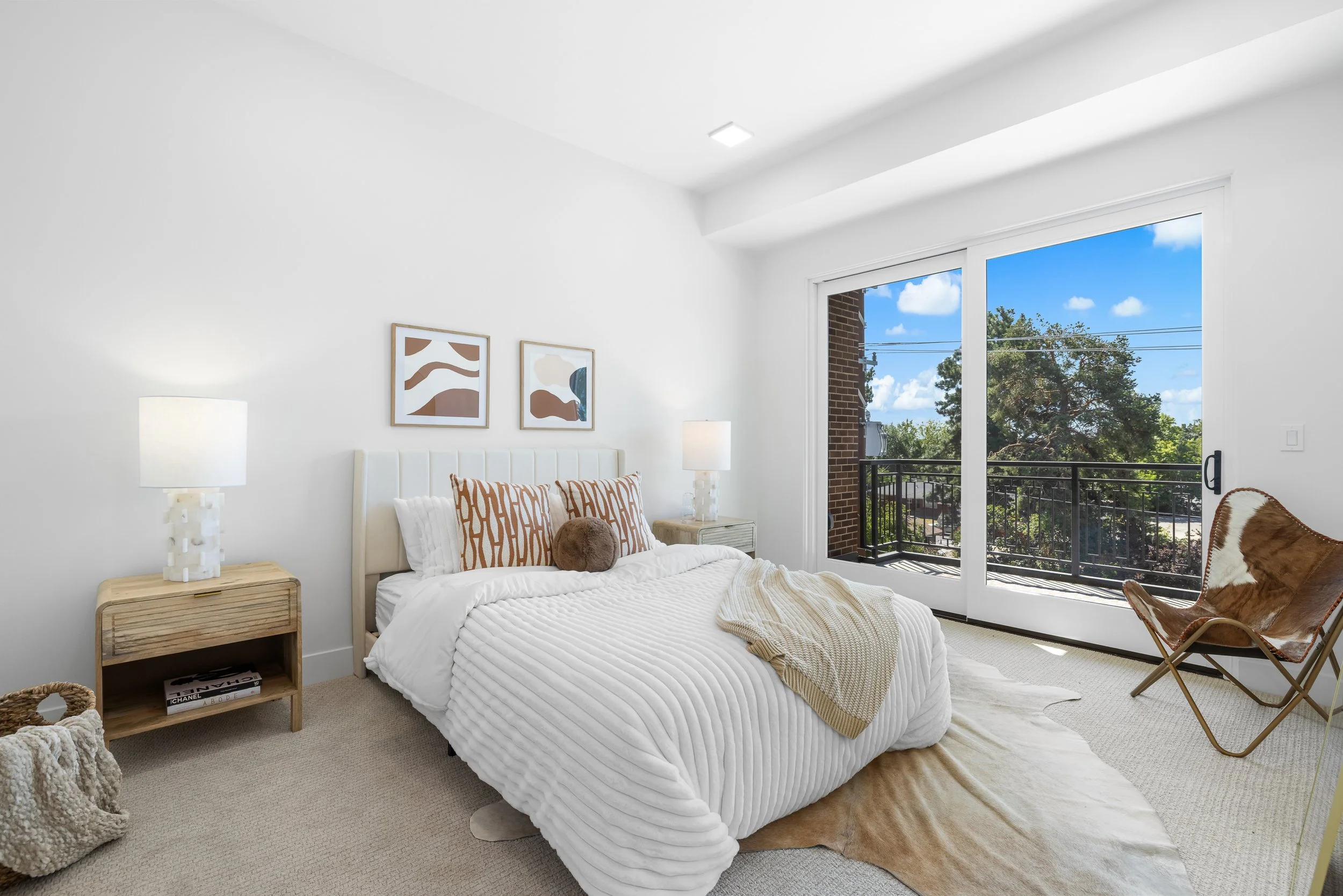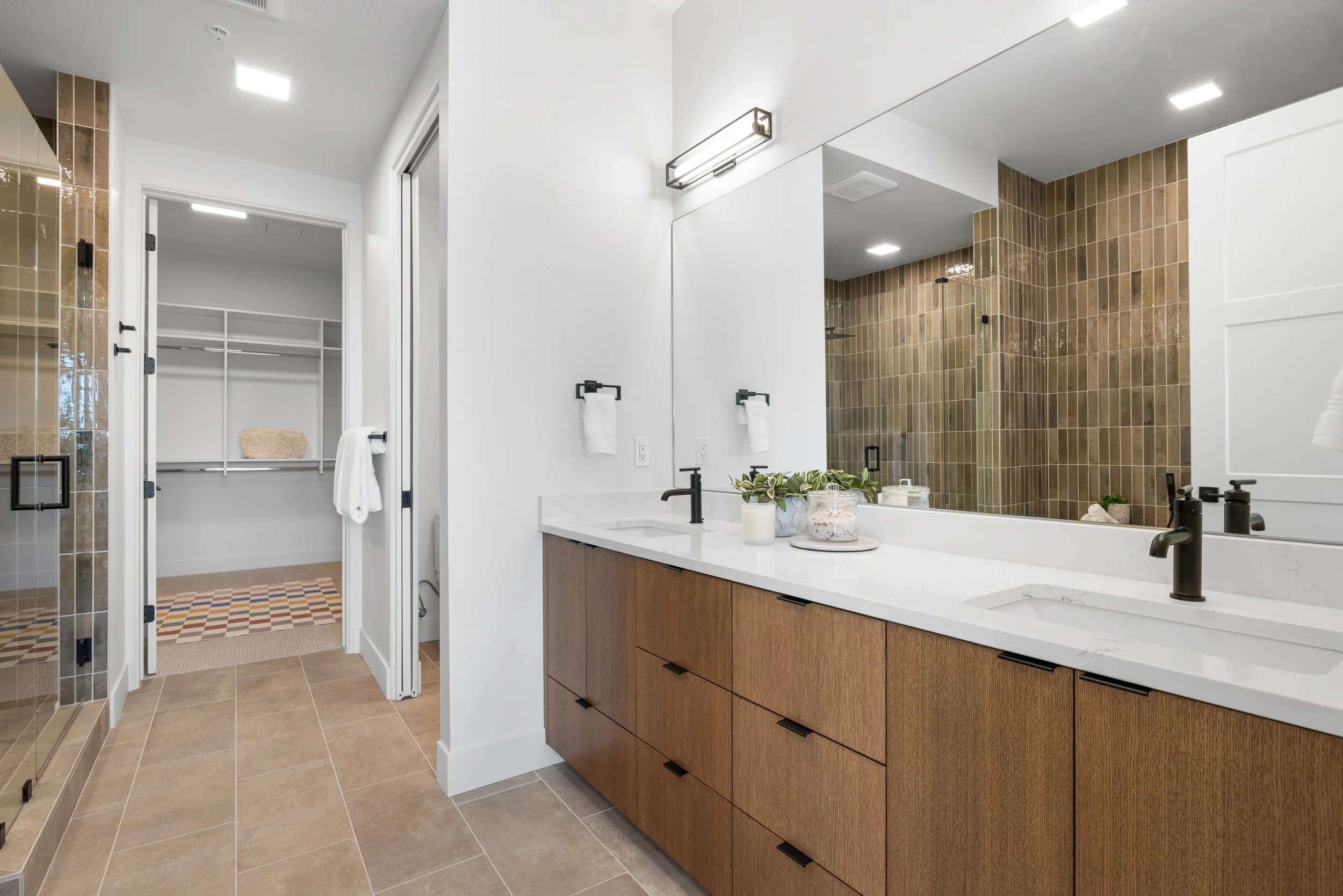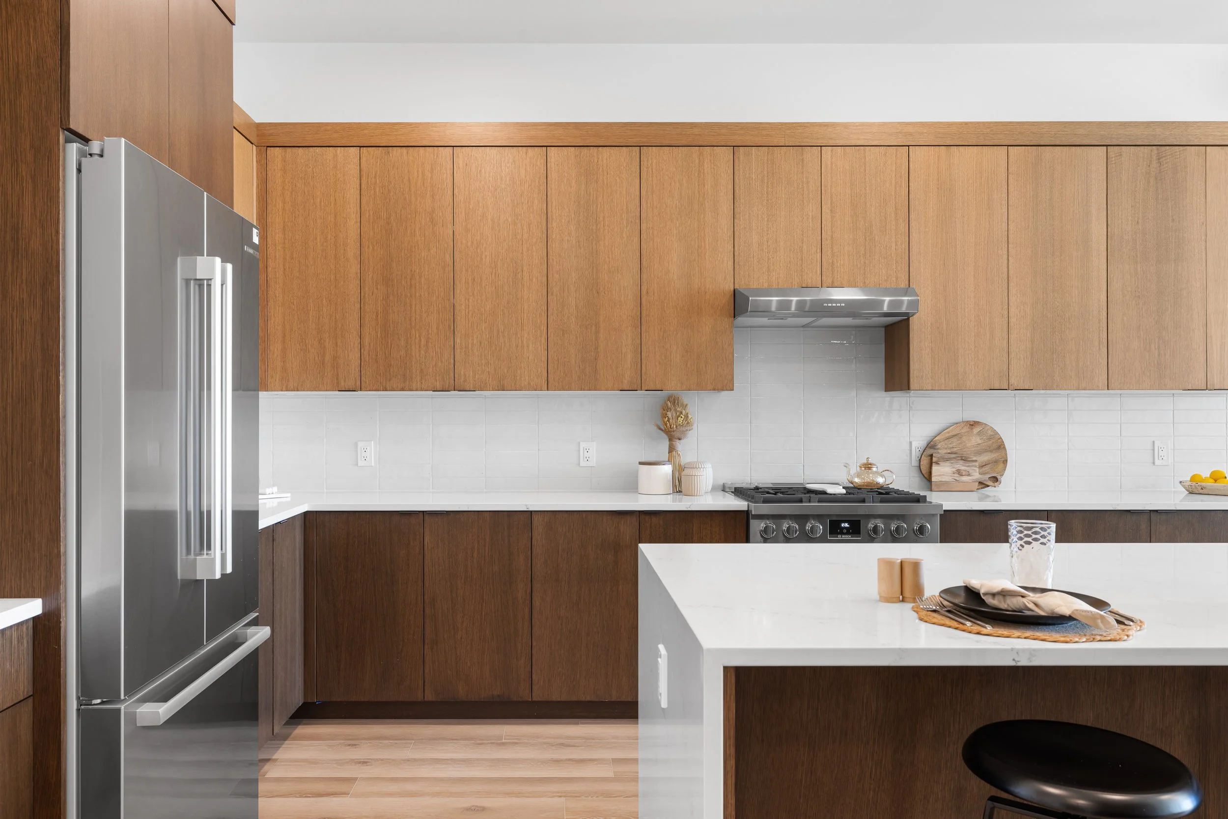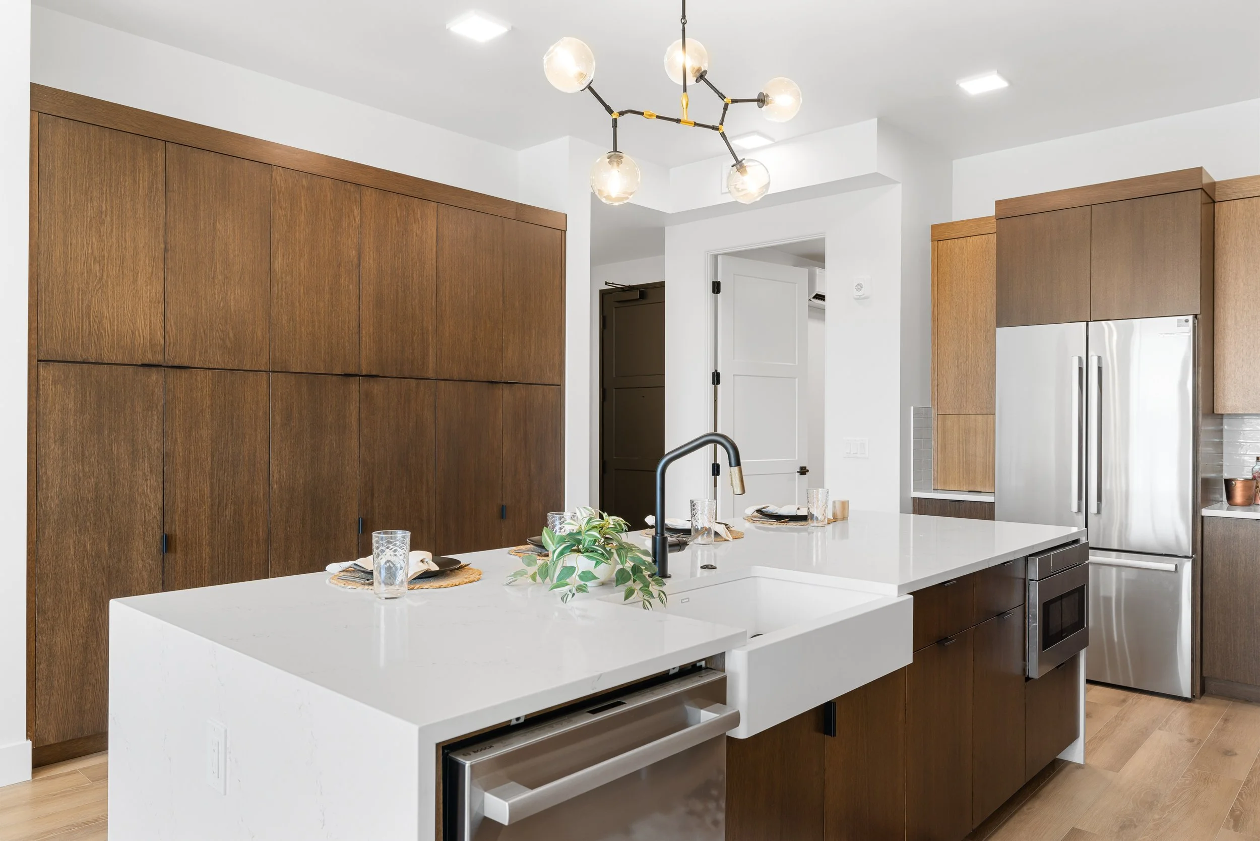The Sol residence showcases coveted southern exposure, where ten-foot ceilings amplify natural light, casting warm radiance across rich walnut millwork and flow through carefully proportioned living spaces. The expertly crafted kitchen features premium Bosch® appliances and an elegant island where morning rituals unfold in golden light. The primary suite provides ultimate retreat, enhanced by a spa-inspired bath with warm stone surfaces and a sculptural soaking tub where daily routines transform into restorative rituals. This residence embodies lock-and-leave leisure where time becomes yours to curate to enjoy each luminous day with a private south-facing terrace that extends the bright living experience outdoors.